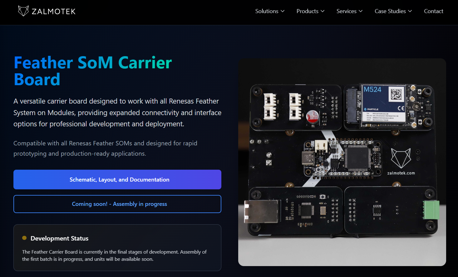 Zalmotek Feather Carrier Board lets Renesas SoMs plug into Feather, and a planned W5500 Ethernet module adds wired networking for industrial/robotics.