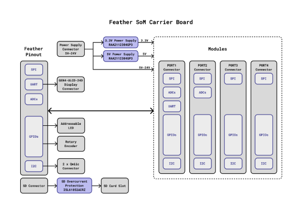 Centered around the Feather SoM Carrier Board, power and key interfaces (SPI, UART, ADC, GPIO, I²C) are distributed across four expansion ports, while peripherals such as a display, Qwiic sensors, rotary encoder, LED, and microSD are integrated to provide a modular configuration suitable for robotics and industrial control.