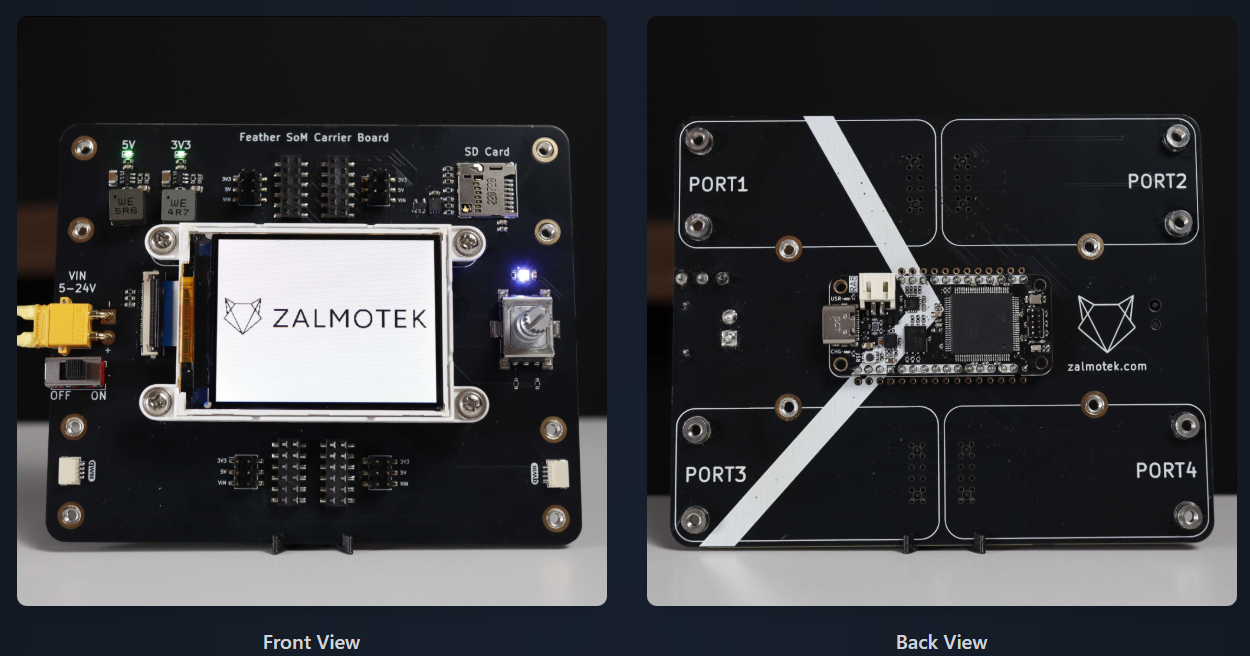 The Zalmotek Feather Carrier Board is a SoM expansion platform designed in the Adafruit Feather form factor, allowing easy integration of Renesas RA6M1, RA8M1, and RZ/A3U SoMs and providing expansion options for various sensors, motors, and communication modules.