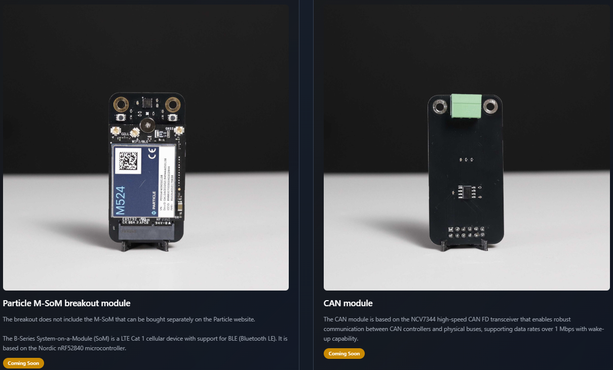 - Particle M-SoM Breakout Module: Expands wireless and cloud-integration features using a Particle M-SoM