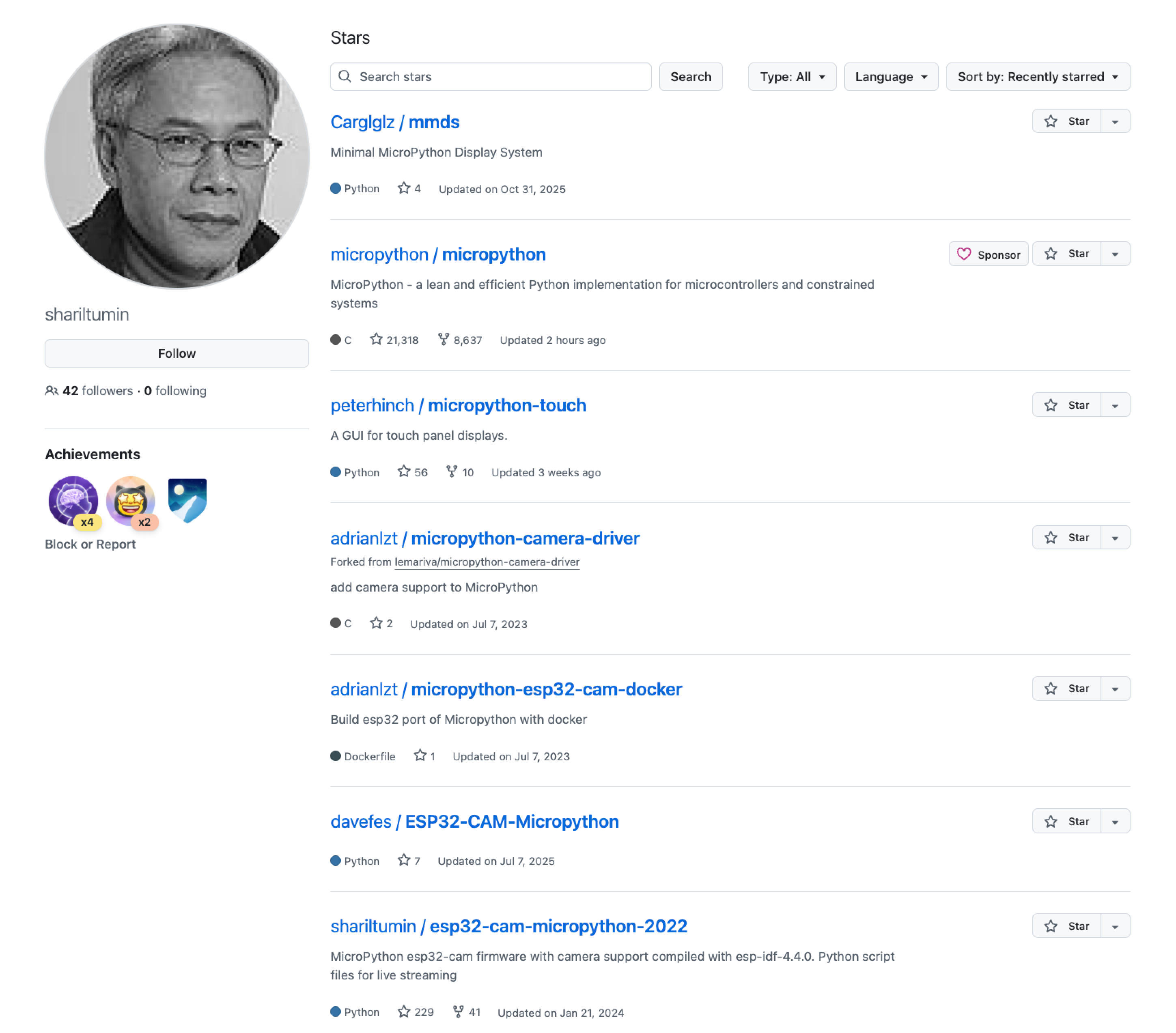 이 프로젝트는 2026년 1월 7일 MicroPython 커뮤니티의 활발한 기여자인 shariltumin이 github에 공개한 따끈따끈한 ESP32-H2 전용 커스텀 펌웨어입니다. 그는 229개의 스타를 받은 esp32-cam-micropython을 비롯해 26개의 MicroPython 리포지토리를 운영하는 ESP32 전문가입니다.