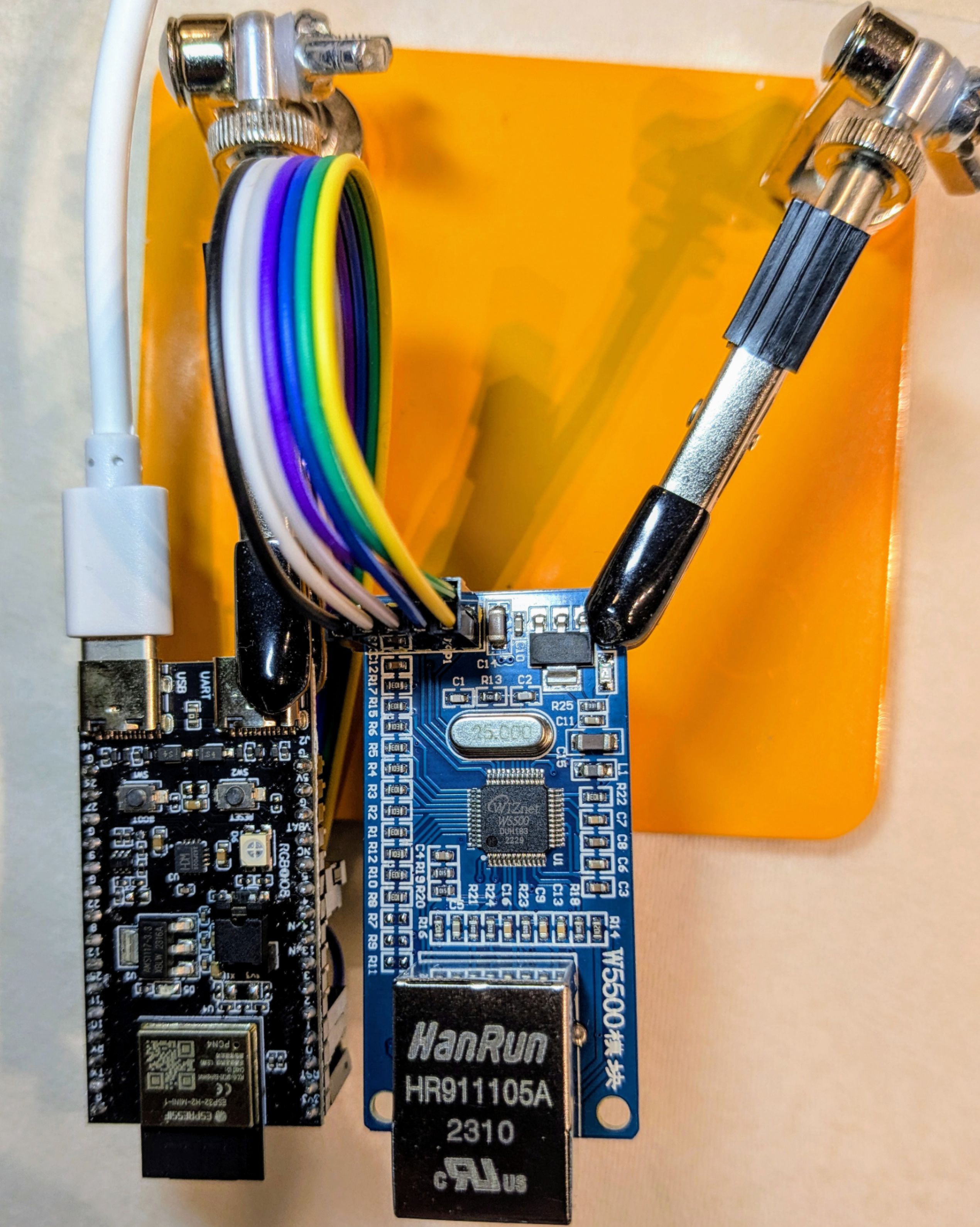 It is based on connecting an ESP32-H2-MINI-1 board and a W5500 module via SPI. The pin map specified in the README is: