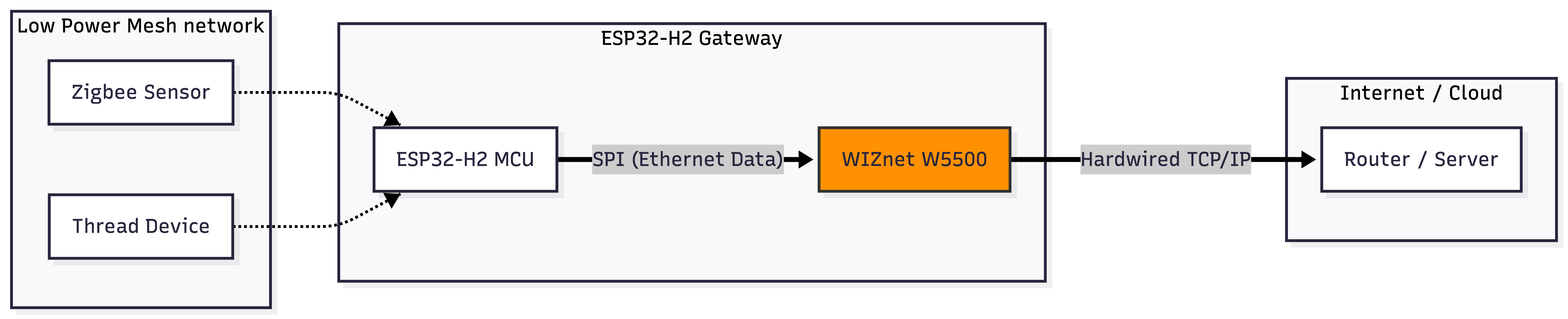 A: Correct, the ESP32-H2 physically lacks Wi-Fi hardware. It is a specialized chip designed solely for IEEE 802.15.4 (Zigbee/Thread) and Bluetooth LE. To send data to the cloud or local servers, you must use an external Ethernet controller like W5500. This is a critical requirement when building Matter Gateways or Zigbee Coordinators.