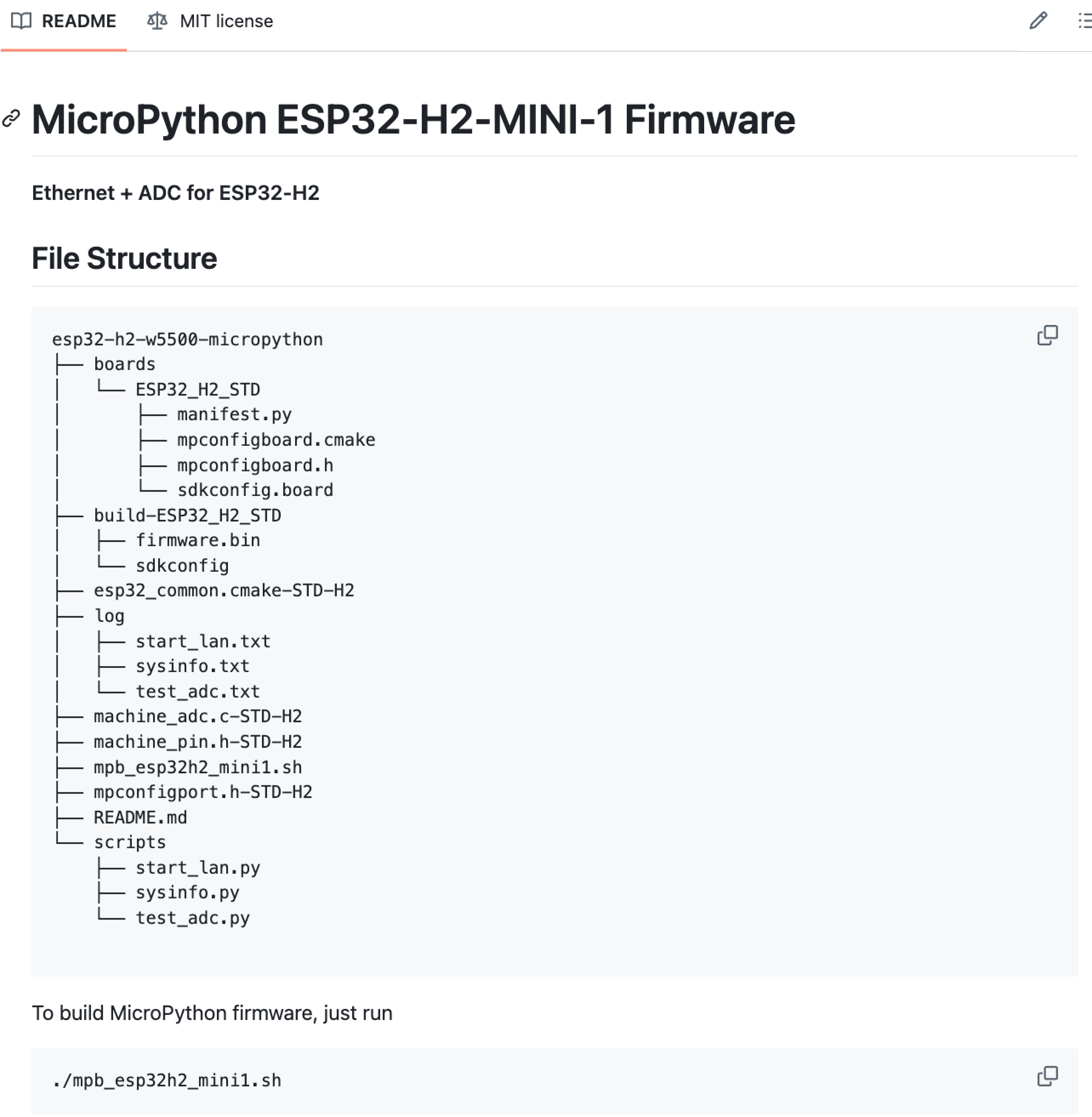 This project provides a production-ready MicroPython firmware for the ESP32-H2-MINI-1, enabling 100Mbps Ethernet via WIZnet W5500.