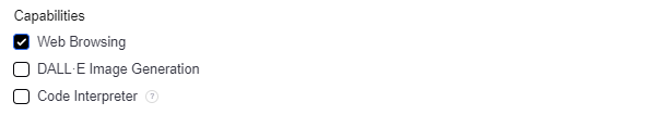 - Capability Settings: Choose functionalities like web browsing, AI image generation, and Python-based analysis in the 'Capabilities' section.