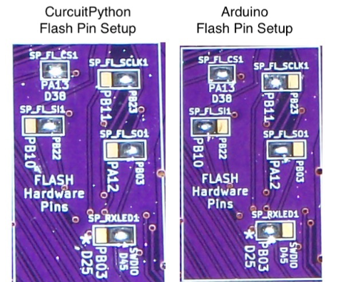 Depending on whether the user uses Arduino IDE or CircuitPython, the flash memory pin configuration can be physically changed using solder jumpers on the back of the PCB.