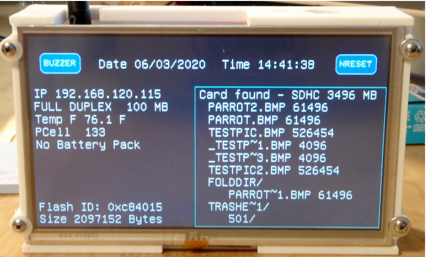 All components function correctly, including detection of 2MB flash memory, listing files from the SD card, and accurate timekeeping via the RTC.