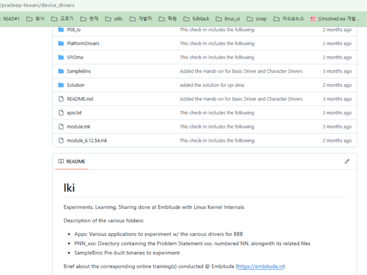 이 저장소는 하나의 완성된 디바이스 드라이버 제품을 보여주는 레퍼런스라기보다, 리눅스 커널 드라이버 개발에서 계층이 어떻게 이어지는지를 단계적으로 익히게 만드는 실습형 저장소로 보입니다. README에서도 실험, 학습, 공유 중심의 코드베이스임을 드러내고 있고, 실제 디렉터리 구조 역시 플랫폼 드라이버, SPI/DMA, 네트워크 드라이버, 블록/파일시스템, 인터럽트, I/O 등으로 나뉘어 있습니다.