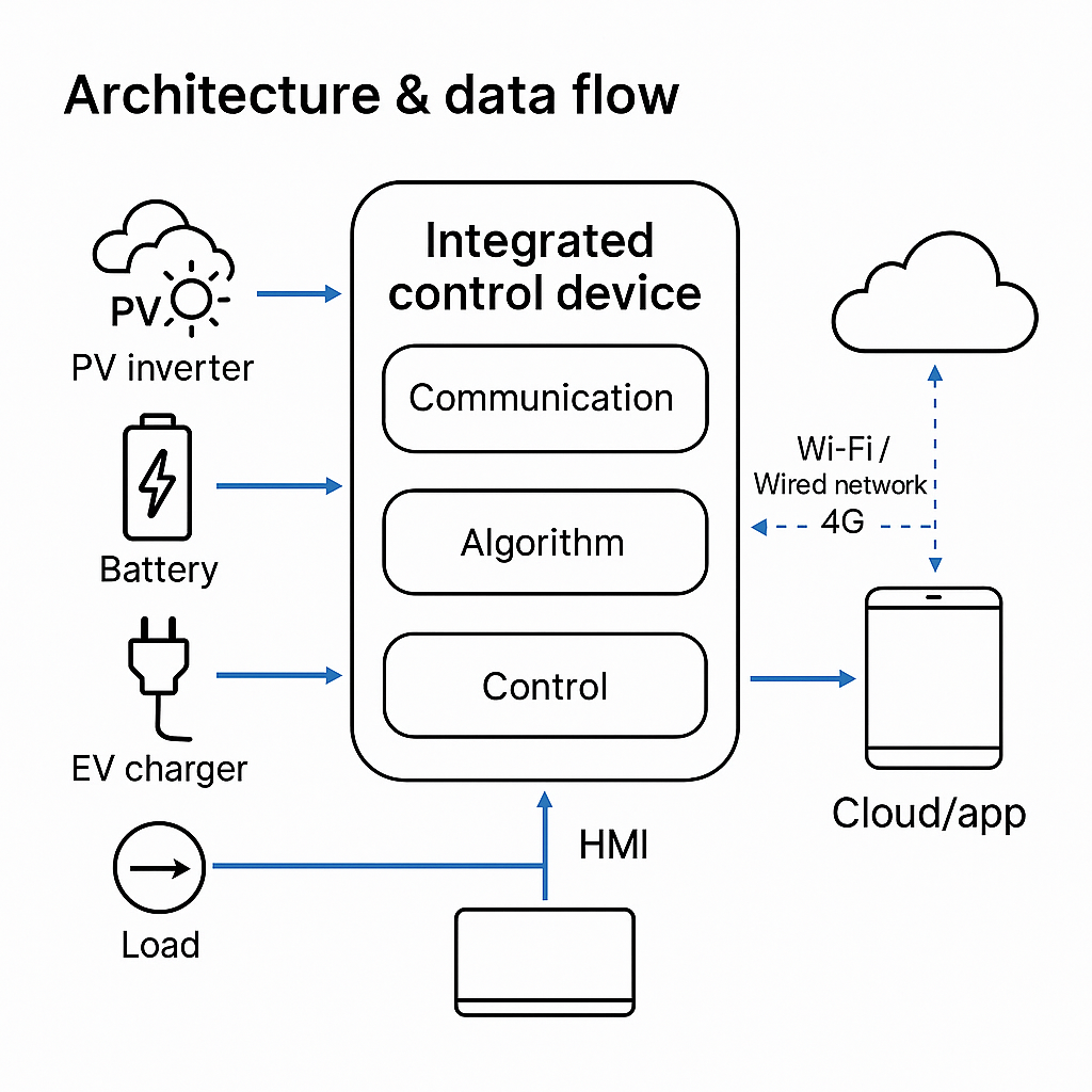 브로셔가 제시하는 통합 제어장치(Integrated control device)는 “통신 모듈 + 알고리즘(AI) + EVSE 제어 + 인버터/배터리 관리 + 장애 처리 + 데이터 저장 + HMI + 클라우드 연동”의 구성으로 설명됩니다. 이를 데이터 흐름으로 풀면 다음과 같습니다.