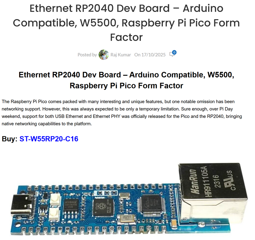 The ST-W55RP20 series is a functional clone of the WIZnet W5500-EVB-Pico, inheriting its core architecture and software ecosystem.