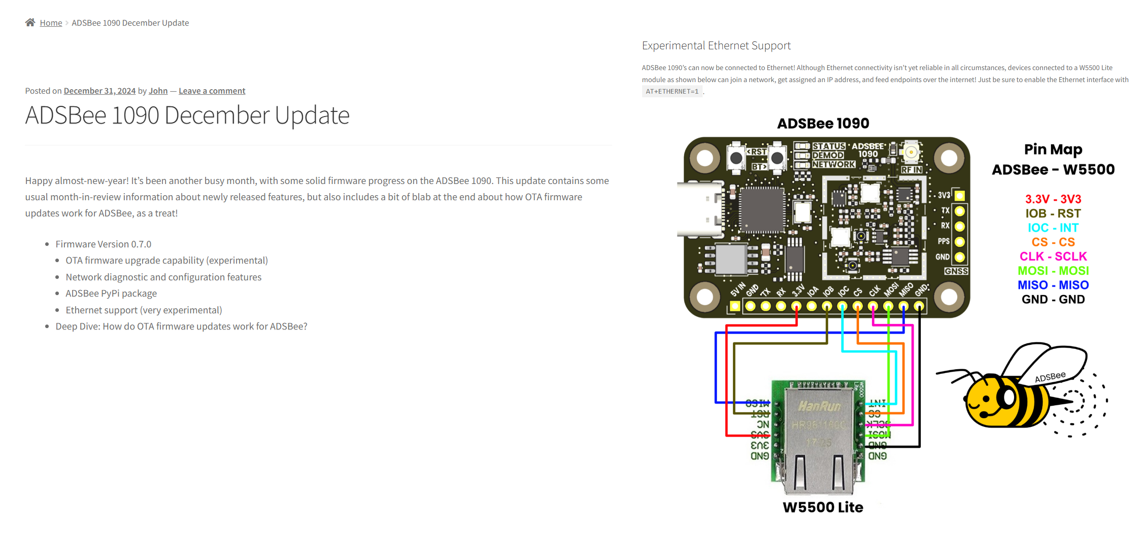 2024년 12월 업데이트에서는 ADSBee 1090에 W5500 Lite Ethernet 모듈을 연결할 수 있는 기능이 추가되었습니다.