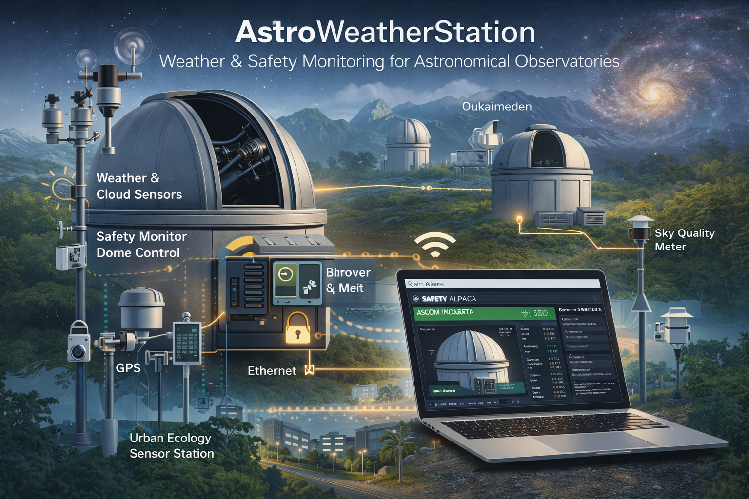 Rather than simply recording weather data, it aims to collect in real time indicators that are directly related to potential damage to observational equipment—such as rainfall, wind speed, and sky brightness (SQM)—and to deliver system status and measurement data to external systems over Ethernet.
