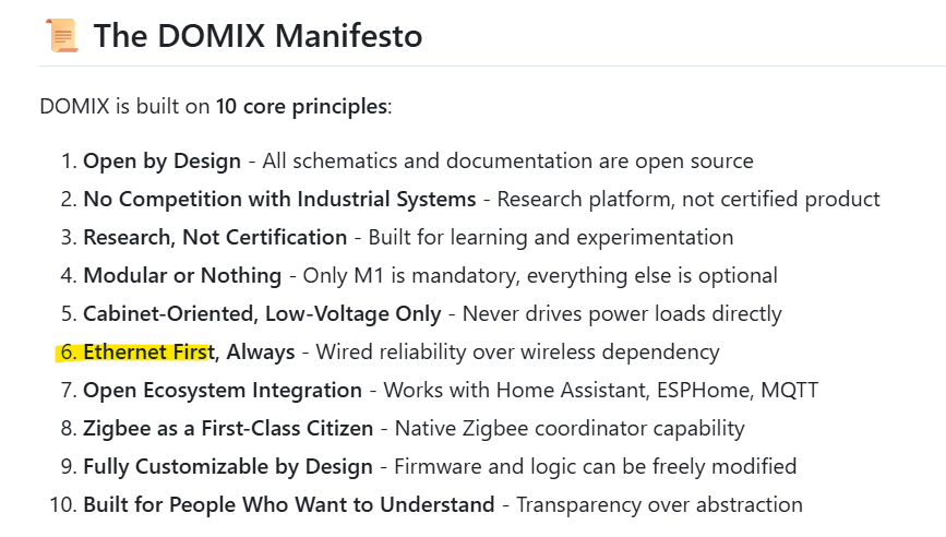 The M1 core uses W5500-based 10/100 Ethernet. The README explicitly states “Ethernet first,” and handles MQTT, OTA updates, and ESPHome integration over a wired network. The design prioritizes reliability and maintainability over wireless instability.