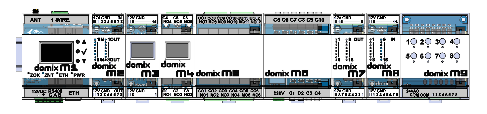 It is based on a system where expansion modules M2–M9 are added as needed around the M1 core. Functions that are not installed can be excluded, allowing flexible configuration ranging from simple relay control to energy metering, sprinklers, and I/O expansion.