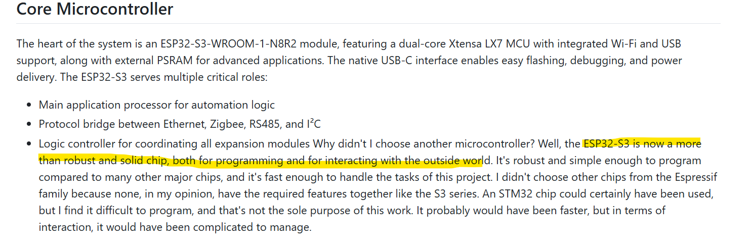 The ESP32-S3 was selected because it is well-suited as a central application processor that must integrate and control Ethernet, Zigbee, RS485, and I²C, thanks to its sufficient processing performance and support for various interfaces.