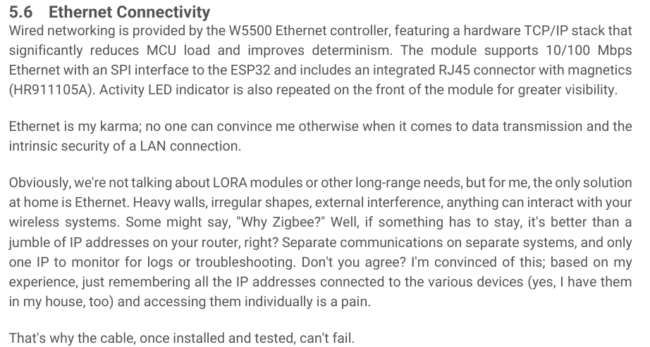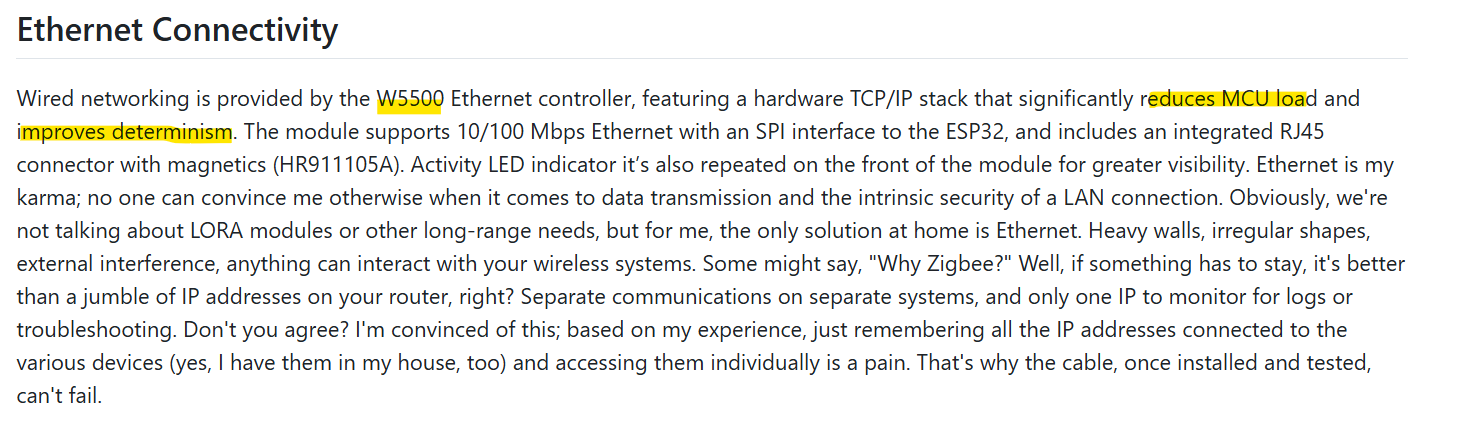 - This project places a core value on an always-connected wired network instead of the instability of Wi-Fi-based DIY smart homes. The README also declares “Ethernet first, always,” indicating that the W5500 is not just a simple component but a key element that embodies the design philosophy of the project.