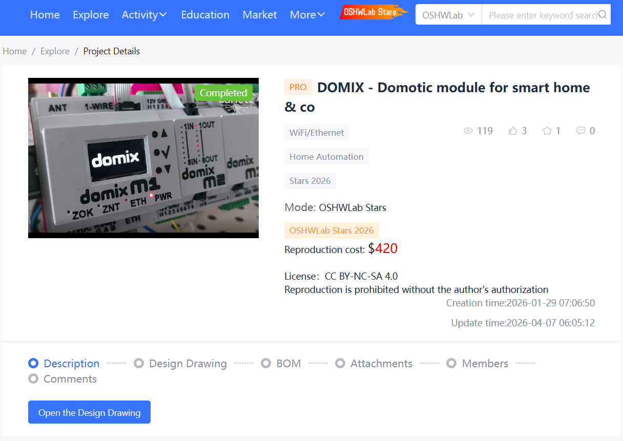 - DOMIX is a project with schematics and PCB designs publicly available on OSHWLab, featuring a structure completed to a level of actually manufacturable hardware. While quantitative metrics such as likes, views, and clones are not currently confirmed based on available data, the nature of the platform provides a practical foundation for design reuse and manufacturing. This goes beyond simple idea sharing and can be evaluated as an open hardware reference project with reproducibility and scalability.