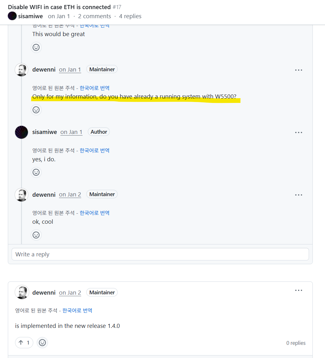 In this project, there are multiple real-world cases of users choosing the W5500 Ethernet module instead of Wi-Fi. As seen in Discussions (#17, #46), users select the W5500 for its higher stability and faster responsiveness, which is especially valuable in automation scenarios such as roller shutter control where latency is critical. Based on this feedback, a new feature was officially added in version 1.4.0 that automatically disables Wi-Fi when Ethernet is in use. This update reflects the growing number of users operating their devices with the W5500.