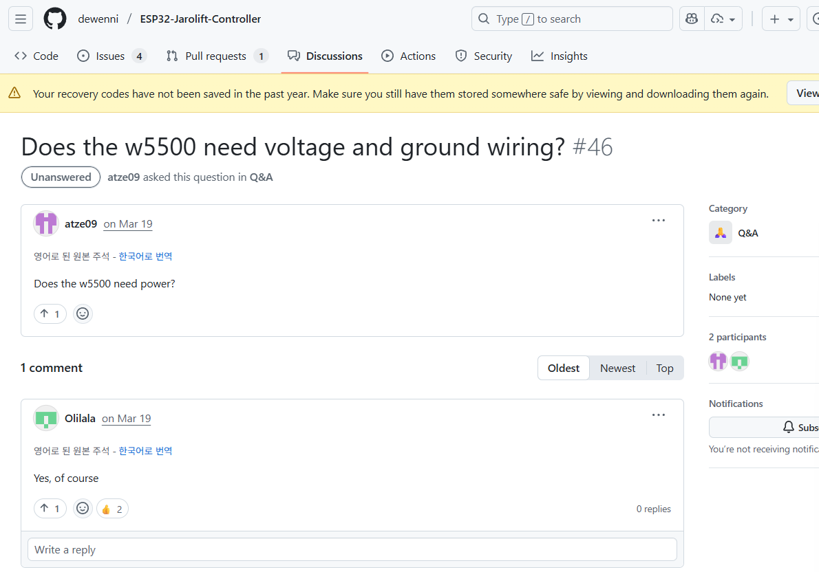 이 프로젝트에서는 Wi-Fi 대신 W5500 Ethernet 모듈을 사용하는 사용자 사례가 실제로 다수 존재한다. Discussions(#17, #46)에서도 확인되듯, 사용자들은 더 높은 안정성과 빠른 응답성을 위해 W5500을 선택하고 있으며, 특히 롤러셔터 제어처럼 지연에 민감한 자동화 환경에서 유선 연결이 큰 장점으로 작용한다. 또한 피드백을 반영해 v1.4.0부터 Ethernet 사용 시 Wi-Fi를 자동 비활성화하는 기능이 공식 추가되었으며, 이는 W5500 기반으로 장치를 운용하는 사용자가 증가했음을 보여준다.
