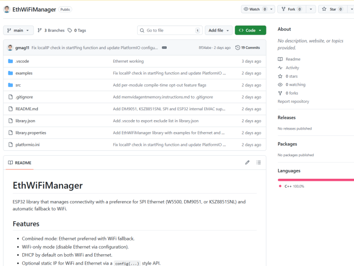 EthWiFiManager는 ESP32에서 W5500(SPI Ethernet) 기반 유선 연결을 우선 사용하고, 장애 시 Wi-Fi로 자동 전환하는 연결 관리 라이브러리입니다.