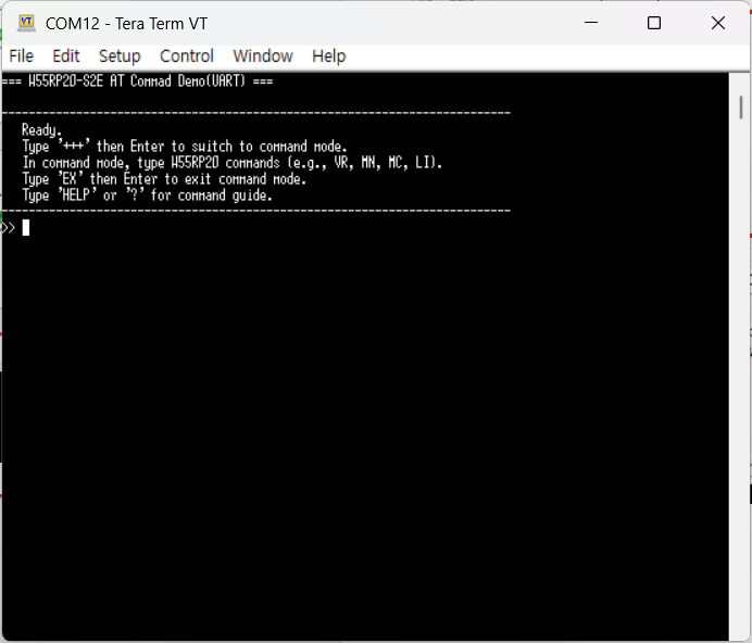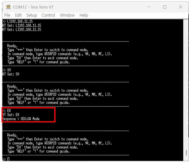 To switch the W55RP20 S2E from AT Mode to GW Mode, enter the 'EX' command and send it to the W55RP20 S2E.