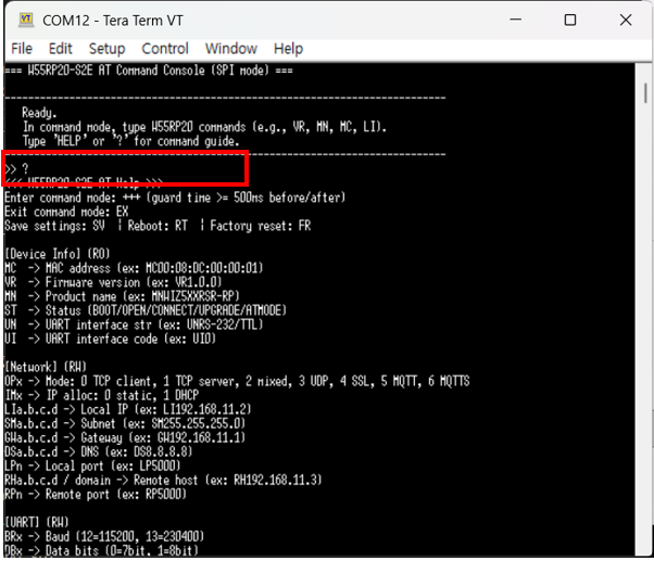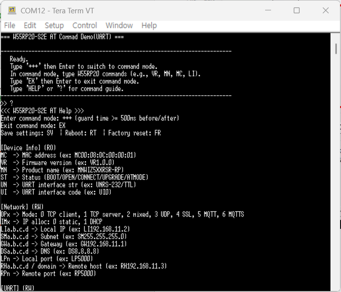 If you enter 'HELP' or '?', the usage instructions for the AT commands will be displayed.