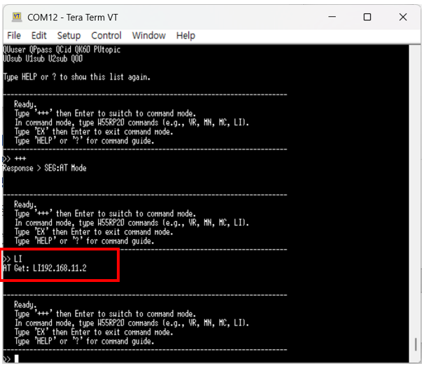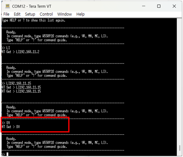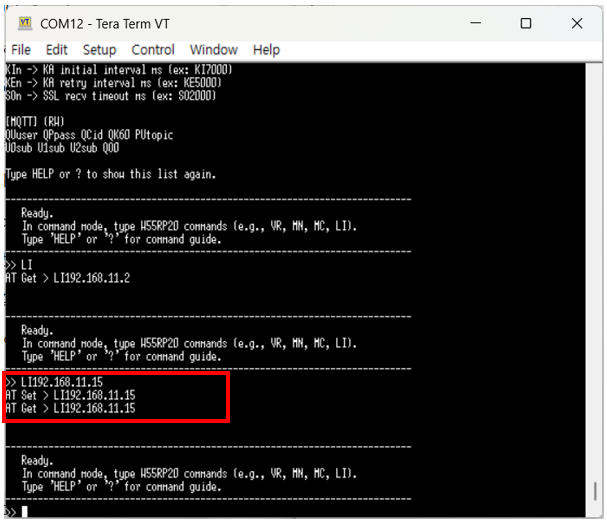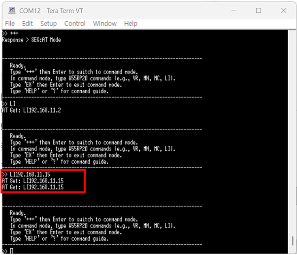 Enter the 'LI192.168.11.15' command to set the Local IP address on the W55RP20 S2E, and then verify that it has been configured correctly using an AT Get command.