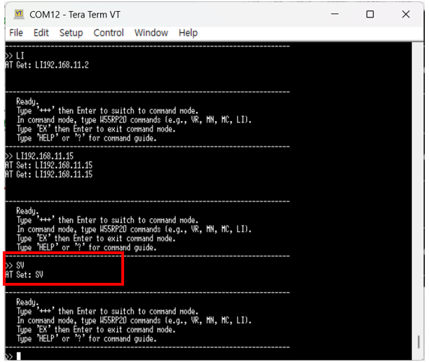 For example, to save the configured command values, enter the 'SV' command and send it to the W55RP20 S2E.