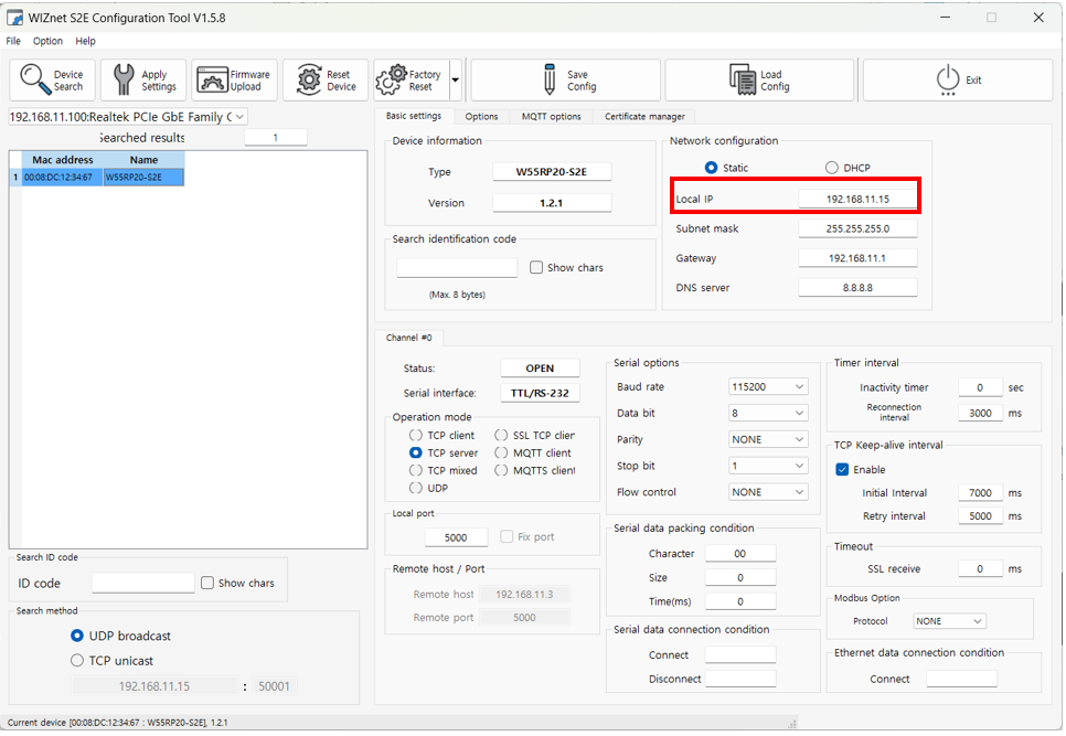 When you perform a search using the WIZnet Config Tool, you can confirm that the Local IP address of the W55RP20 S2E has been changed.