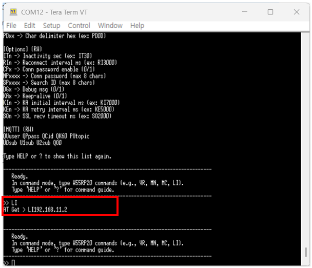 For example, enter the 'LI' command, which represents the Local IP value, to send it to the W55RP20 S2E and receive the Local IP address in response.