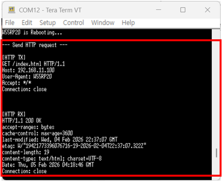 The W55RP20-S2E is configured as an HTTP client via UART or SPI, enabling it to send GET requests to an HTTP server and receive responses.