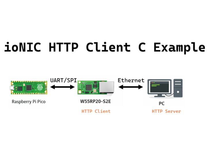 The Raspberry Pi Pico sends an HTTP GET command to the W55RP20 S2E board via UART or SPI, and when the board receives a response from the PC’s HTTP server, it retransmits the response back to the Raspberry Pi Pico through UART or SPI.