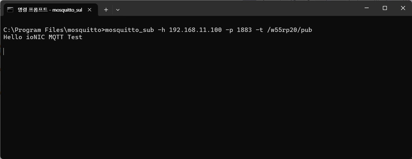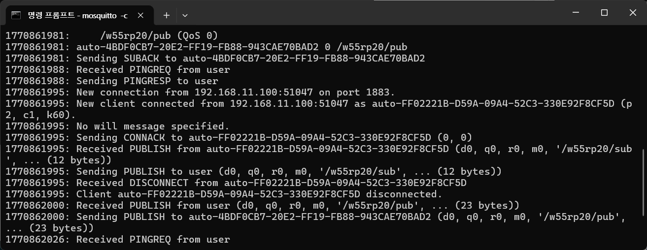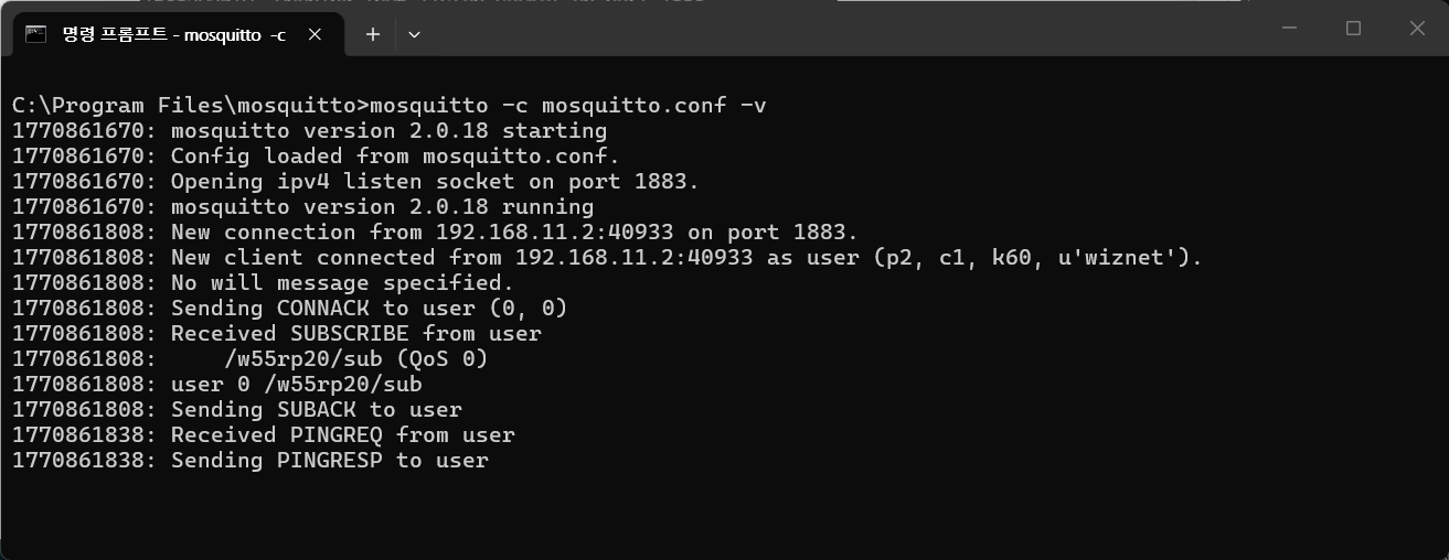 2. After the W55RP20-S2E is configured as an MQTT client and successfully connects to the MQTT broker running on the PC, the Windows terminal displays a message as shown below.