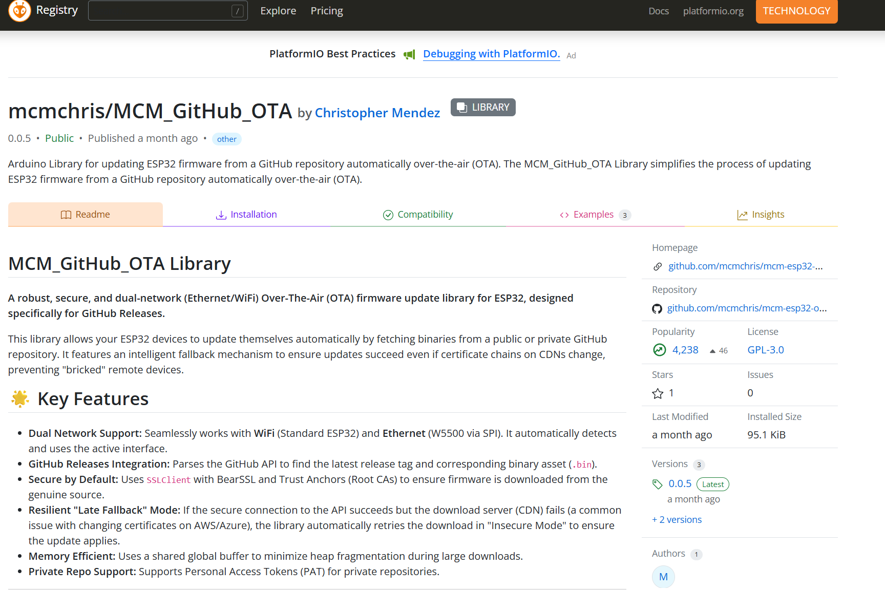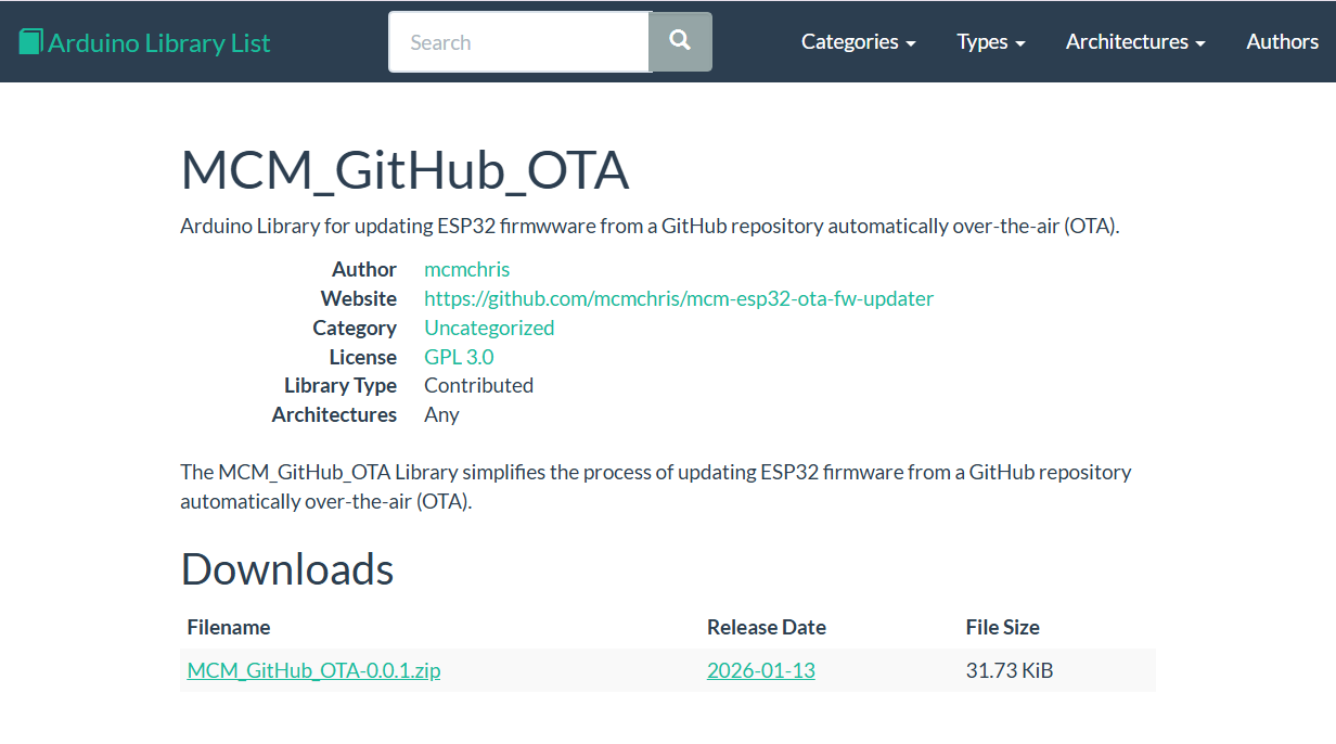 - The library is listed as a contributed library on the Arduino Libraries site, with a registration history for MCM_GitHub_OTA-0.0.1.zip. This can be seen as a signal that it is beginning to move beyond a personal repository and enter broader library distribution channels.