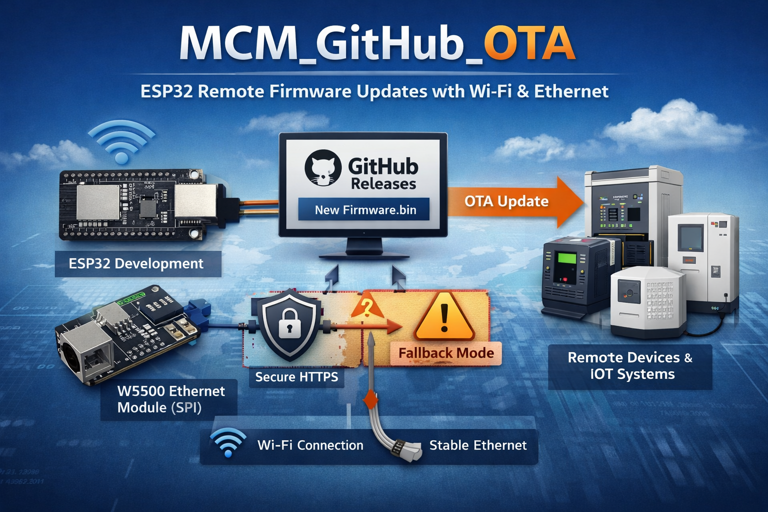 MCM_GitHub_OTA is an OTA library designed to allow ESP32 devices to remotely download new firmware uploaded to GitHub Releases and update automatically. The key point is not just a simple OTA implementation, but that it supports both Wi-Fi and Ethernet (W5500 via SPI), and incorporates a delayed fallback mechanism that accounts for situations where GitHub API queries succeed but binary downloads fail due to CDN certificate chain issues.