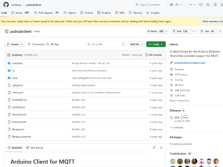 PubSubClient는 Arduino 환경에서 MQTT 클라이언트 기능을 간단히 제공하는 대표 라이브러리이며, GitHub/Arduino 생태계 지표에서 광범위한 채택이 확인됩니다.