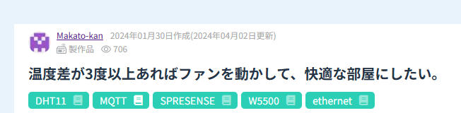 An IoT system using Spresense and W5500 to monitor indoor temperature differences and control a fan, sending data to an MQTT server over Ethernet.