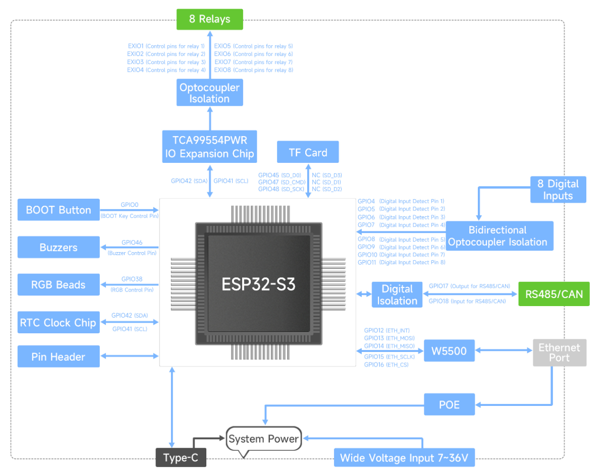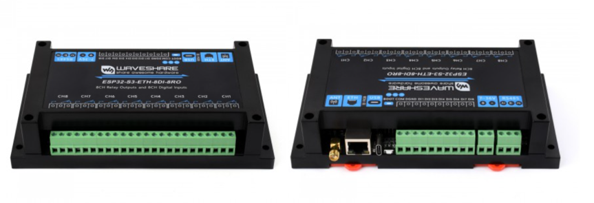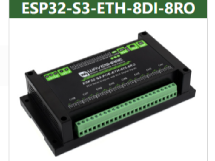 The ESP32-S3-ETH-8DI-8RO is an industrial 8-channel network relay module based on the ESP32-S3, supporting Wi-Fi, Bluetooth, RS485, and Ethernet for immediate use in a wide range of AIoT environments.