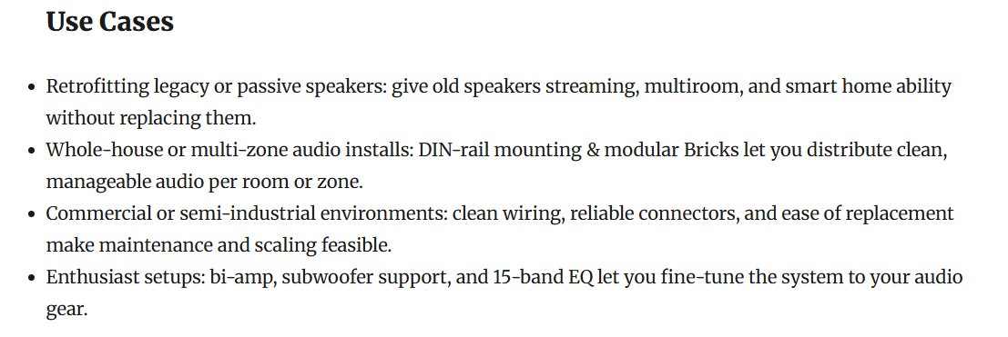 - Multi-room audio solutions for home environments (installed per room or zone)
