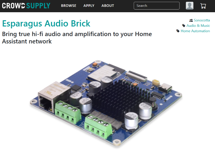 Esparagus Audio Brick is an ESP32-based compact Hi-Fi DAC and amplifier module designed as an open-hardware project that turns ordinary speakers into smart audio devices integrated with Home Assistant.