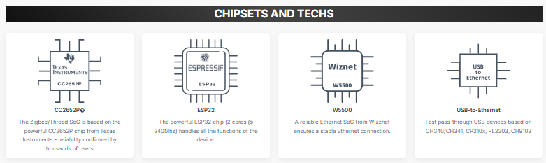The WIZnet W5500 provides Ethernet connectivity, enabling stable communication with hubs and servers such as Home Assistant, Zigbee2MQTT, ZHA, and OTBR.