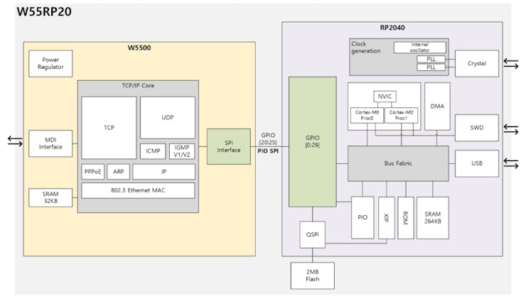 WIZnet developed a chip that combines RP2040 and W5500. Let's take a look at the new chip, W55RP20