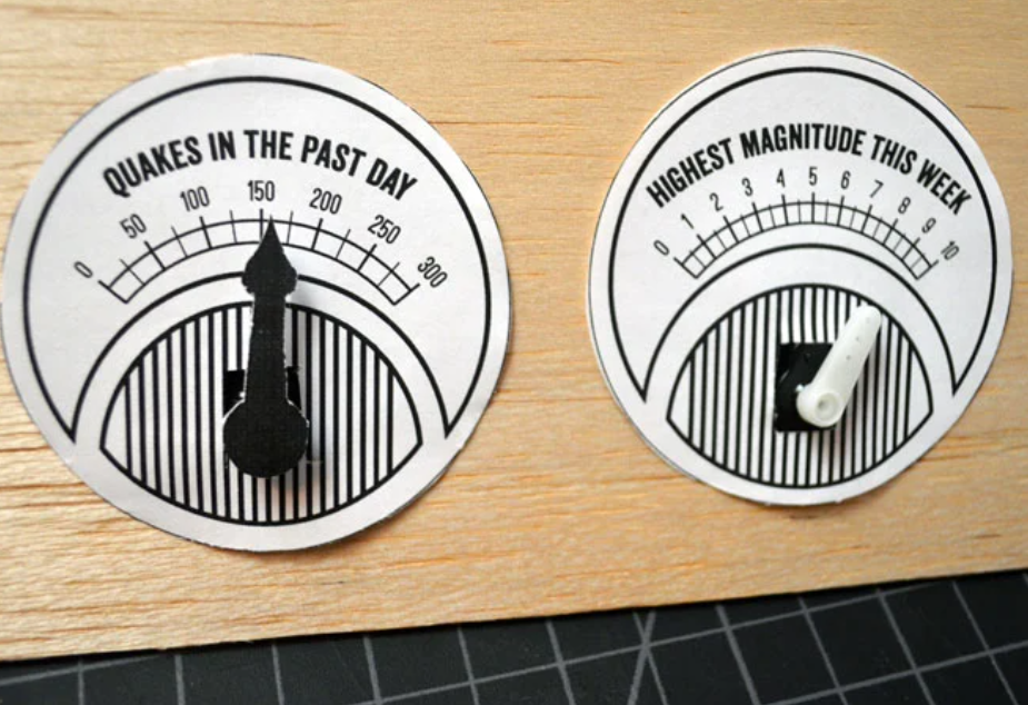 이 프로젝트의 데모 데이터는 **전 세계 지진 활동(USGS 실시간 데이터 피드)**이다. Arduino가 네트워크로 USGS 데이터를 받아오고, 그 값을 서보 모터 각도로 바꿔 다이얼을 움직인다.