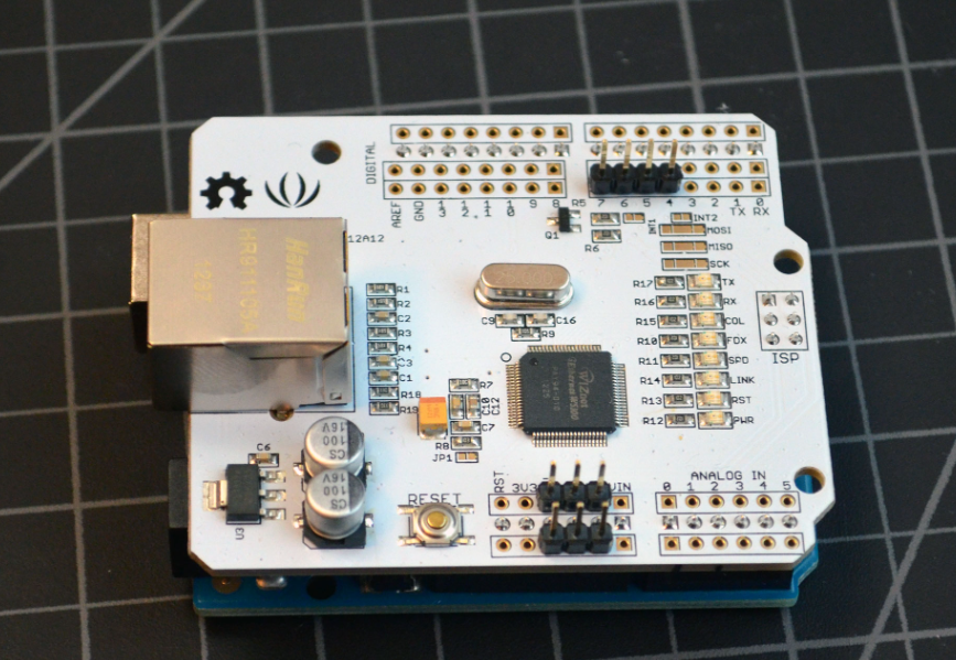 이 프로젝트의 인터넷 연결은 Arduino Ethernet Shield가 담당하며, Arduino 공식 문서 기준으로 Ethernet Shield V1은 Wiznet W5100 기반이다. W5100은 TCP/UDP를 지원하고 최대 4개 소켓을 제공하는 것으로 안내되어, Arduino가 웹 데이터를 받아오는 네트워크 기능의 핵심 역할을 한다.