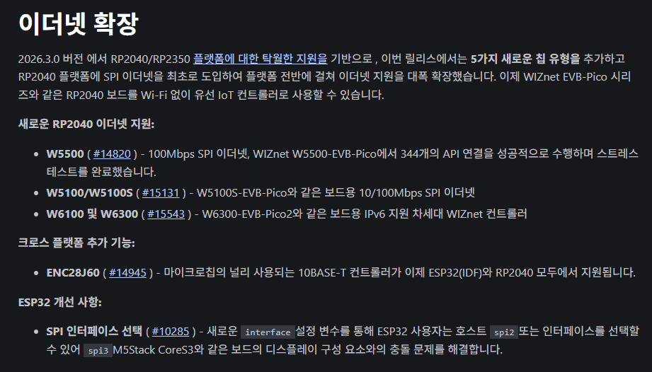 - 2026.4.0의 핵심은 RP2040 첫 지원이 아니라, RP2040용 SPI Ethernet 지원 추가로 보는 것이 맞음.