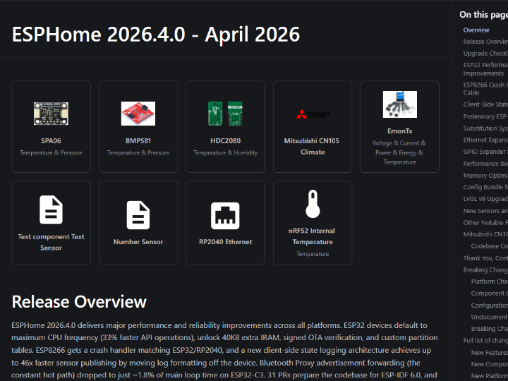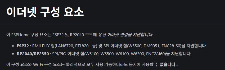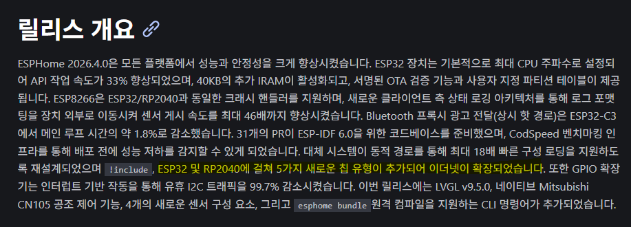 “RP2040은 기존에도 ESPHome 지원 이력이 있었고, 2026.3에서 본격 플랫폼 지원 강화, 2026.4에서 W5500 중심 Ethernet 지원이 공식 확장된 것”으로 해석하는 것이 적절함.