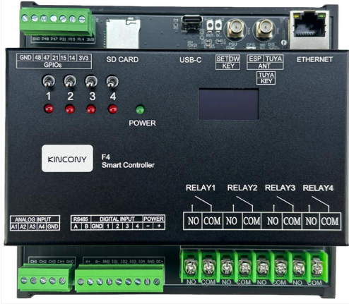 KinCony F4는 “ESP32 릴레이 보드” 수준을 넘어, Ethernet + 입력(0–5V/4–20mA/접점/1-Wire) + RS485 + RTC까지 묶어 제어반에 바로 넣는 컨트롤러로 포지셔닝된 제품입니다.