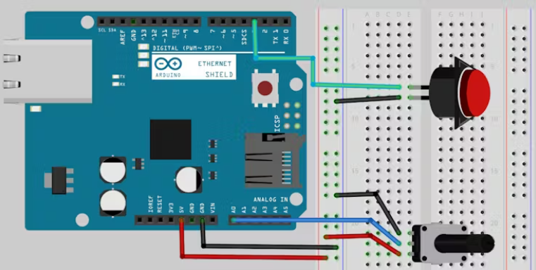 이 프로젝트는 스마트폰에서 실행되는 Lunar Lander(자바스크립트 게임) 를, Arduino UNO + Ethernet Shield 로 만든 물리 컨트롤러(버튼 + 가변저항)로 조종하는 제작기입니다.