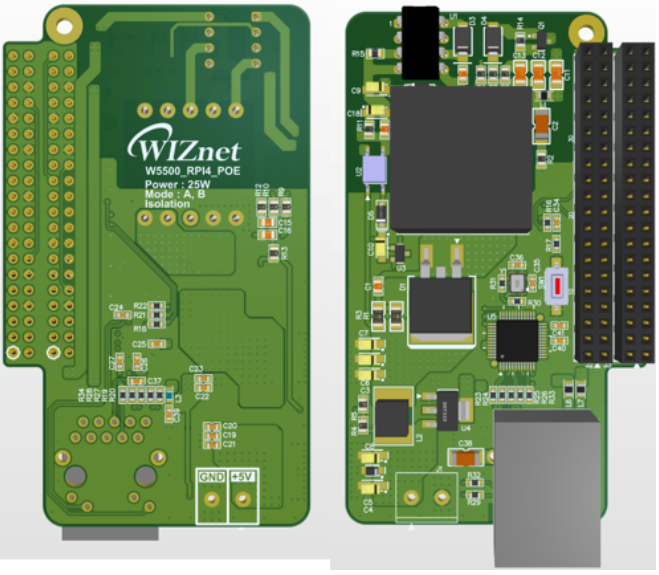 This board is designed to use Ethernet using the WIZnet Chip. Of course, the existing Ethernet can also be used. In addition, it was designed to be used up to PoE+, which can be used not only through the WIZnet connector but also through the existing Ethernet connector.