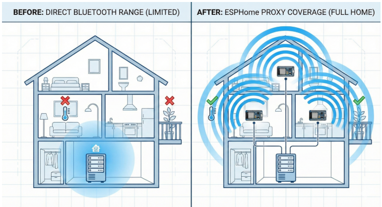 To address these challenges, ESPHome introduces the concept of a Bluetooth Proxy, which extends Bluetooth coverage by distributing ESP32-based nodes throughout the environment.